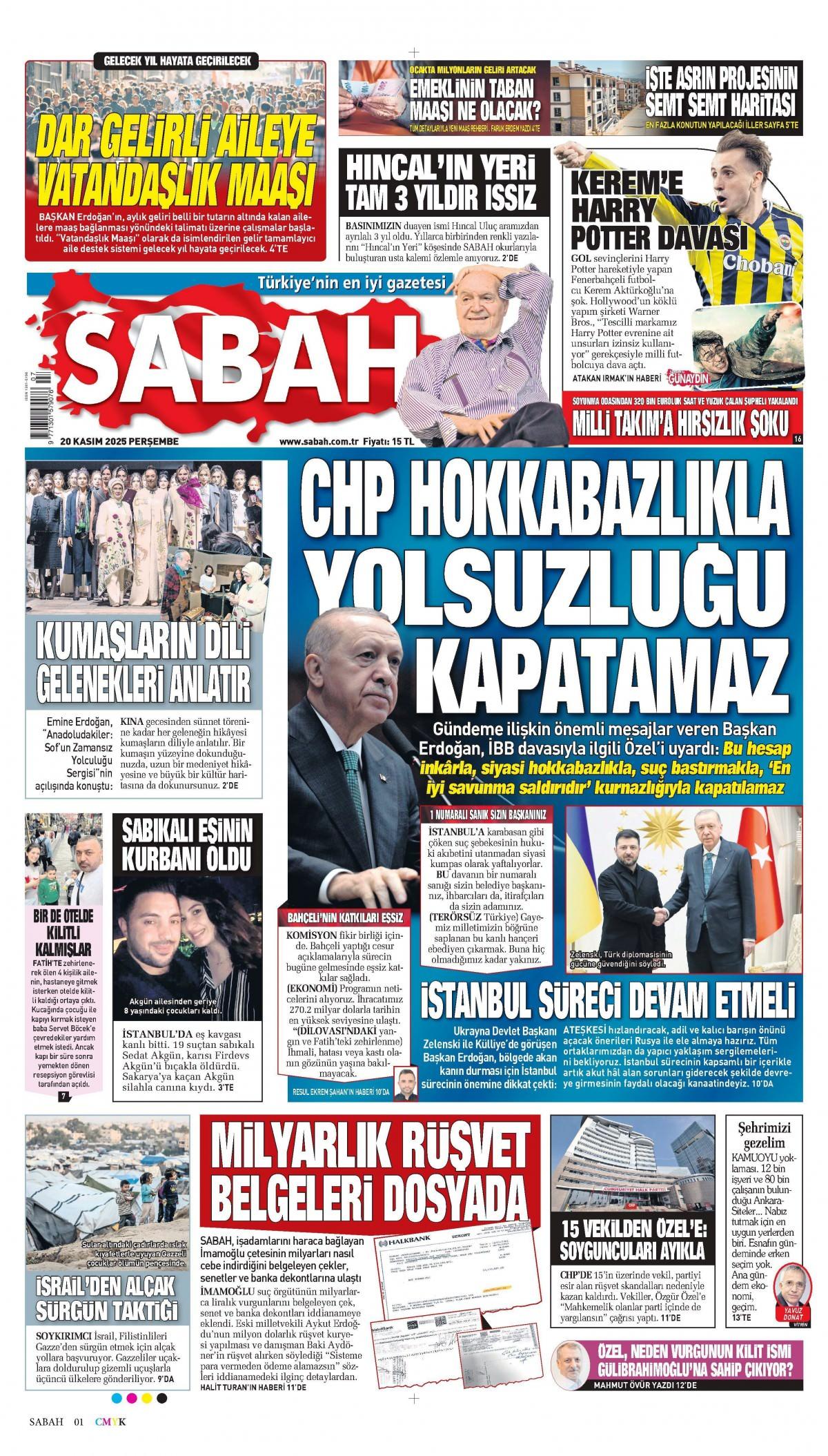 Sabah Gazetesi 20 Kasım 2025 Günü Manşeti